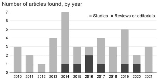 As shown in Figure 1, the total number of articles found in the literature review fluctuates across the years. The highest number of articles (seven) were found in 2014, with about one review or editorial per year on average from 2014 onwards. Articles from the peak in 2014 generally focus on laying the frameworks for assessing volunteered geographic information (VGI) quality [18,19], along with the development of methods for assessment [20,21,22,23]. In recent years, despite the lower number of articles, the field developed in several new directions, such as in more sophisticated statistical machine learning methods for quality assessment [24,25] and POI matching [26,27]. Recent studies also explore novel data sources beyond OSM, such as LBSNs and review websites [27,28], and broader applications of POI data [10,29,30].