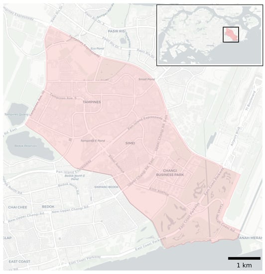 Overview of study area of Tampines (red polygon), located in east of Singapore (inset). Map tiles by Carto, under CC BY 3.0. Data by OpenStreetMap, under ODbL.