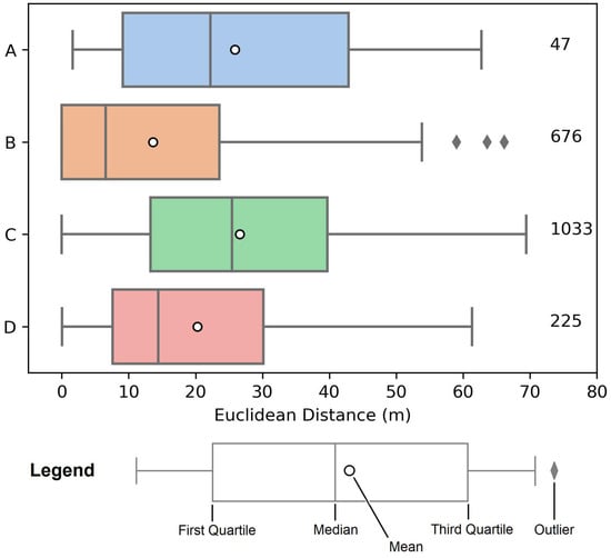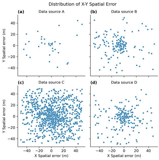 Figure 3 and Figure 4 show the distribution of spatial error between corresponding points in and , where spatial error is measured with both the euclidean distance and the x-y distance. All points were projected to the planar SVY21 coordinate reference system (EPSG: 3414) before distances were calculated. In general, the points in are within 70 m of the corresponding point in . In terms of mean euclidean distances, Data sources B and D have lower spatial error compared to data sources A and C. The lower spatial error for data sources B and D might be a result of possible bulk POI imports from governmental sources. The spatial error of data source A has a comparable mean and distribution compared to data source C, but the low number of points in data source A limits any further conclusions on its positional accuracy. Visually, the distribution of x-y errors (Figure 4) do not exhibit bias in any direction, and the errors are scattered radially about the origin (0, 0).