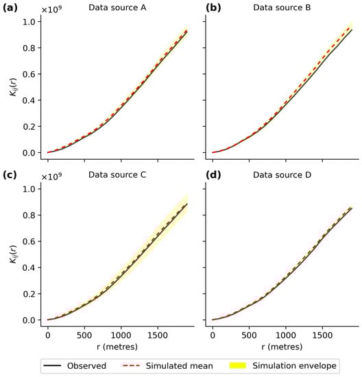 This is followed by a test for statistical significance using a Monte Carlo simulation in which the points from i and j are randomly relabeled. The observed cross-K function is then compared with the simulation envelope of cross-K functions with random relabeling. If the observed cross-K function falls within the simulation envelope, then the point patterns cluster similarly to each other. If the observed cross-K function falls below the simulation envelope, then the point patterns are spatially segregated from each other. In this case, it is suggested that conflating POIs from different spatially segregated sources can be beneficial in improving data coverage [28].
