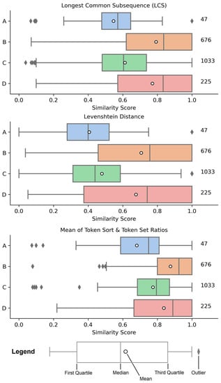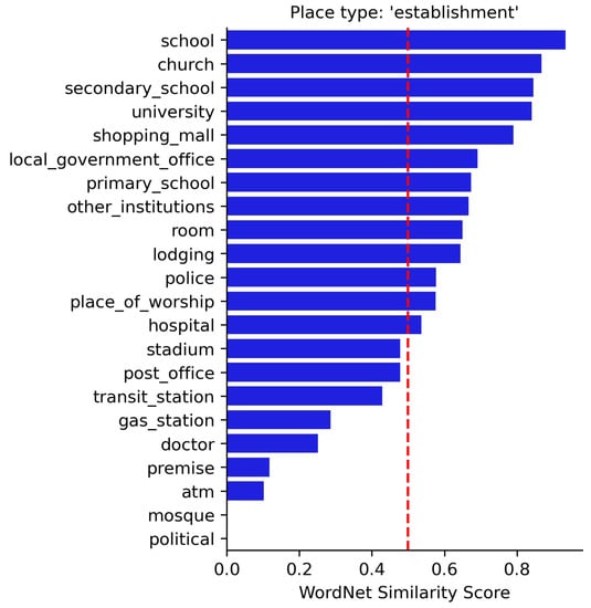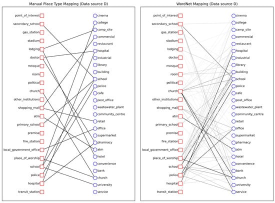 When a correspondence between points in and in was established, the string similarity in POI names in and in can be quantified with several string distance measures like the Levenshtein distance, Longest Common Subsequence (LCS), or the mean of the Token Sort Ratio and Token Set Ratio [4,19,29,40]. For POI place types, similar comparisons can be made, ranging from a simple calculation of the proportion of POIs in with the same place type as the corresponding point in [20,34,41,47,48], or by comparing semantic similarity (such as with the WordNet Similarity Metric) between the place types in and [40,49,50,51]. When is unavailable, calculating the proportion of POIs in with missing attributes provides an indication of thematic accuracy [20,41,52].