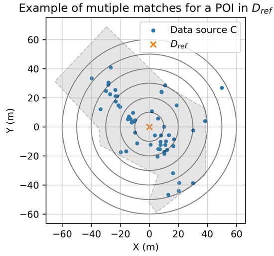 The wider spread of spatial errors for data sources A and C could be due to the data sources having more detailed POIs of individual establishments. When located within a larger complex, these detailed POIs are matched to the aggregated version of the POI in , which might be located at the centroid of the complex. This phenomenon will be elaborated in the subsequent section on many-to-one matches (Section 5.1).