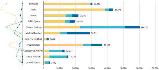 Users using different social media platforms have an obviously differentiated preference for urban scenes (Figure 3). The local citizens, as defined as the Foooooot users, took more photos of natural scenes, but experienced fewer activities than the users of Flickr and Panoramio did. However, some consistency still exists. The shares of historic heritage sites, modern buildings, transportation, water, etc., are high across all subsets of datasets. The complementation between these datasets suggests the necessity of data aggregation for a comprehensive understanding of the city image for most social groups.