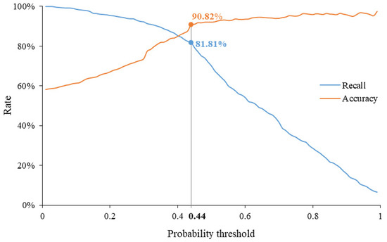 The whole process in this research is data-driven. However, we still need to define thresholds that are used. The first is the threshold of the scene probability for filtering out invalid data. By plotting the accuracy and recall rate as percentages, we selected one pair of turning points along the curves, maximizing these two aspects of model performance. Therefore, the probability threshold was calibrated as 0.44 with a recall rate of 81.81% for the testing dataset (Figure 4). Another parameter that must be calibrated is the reachability distance parameter in the OPTICS algorithm. This parameter is used to control the size of the clusters when the density threshold is relaxed. One challenge for adaptive density-based clustering techniques is to balance the density and size effects, avoiding the underestimation of the size of the clusters with higher density and the overestimation of the size of those with lower density. By comparison with several well-known named areas in Beijing, we selected a threshold reachability distance of 0.01 to define the cluster boundaries. These thresholds were proven to be optimized than others in various criteria and the results were validated preliminarily.