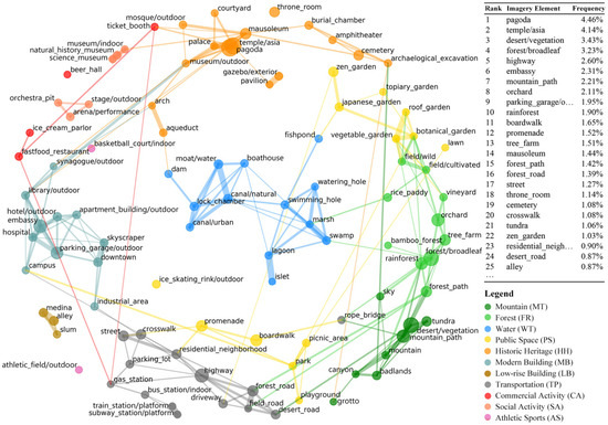 Imagery elements are not independent layouts in urban reality but are interdependent in shaping city scenes from place to place. Understanding of the interdependent elements in any given area can be manual for designers to reshape more meaningful images than those using those unrelated elements. The association among the detected imagery elements of Beijing is mapped as a correlation network. In the detected imagery elements, the top three elements of the images of Beijing that are most often captured in people’s photos are “pagoda” (4.46%), “temple/Asia” (4.14%), and “desert/vegetation” (3.43%). These elements portray the historical characteristics of this ancient capital and landscape features due to the dry climate in North China. Figure 5 illustrates the similarity network encompassing the top 100 imagery elements with stronger linkages that were recognized. The links between imagery elements either reflect their co-presence in the photos that were taken by the citizens, e.g., “library” and “museum”, “park” and “campus”, and “vegetable garden” and “field/wild”, or reflect their co-occurrence, e.g., “industrial area” and “highway”, “rope bridge” and “forest/broadleaf”, “fishpond” and “Japanese garden”, and “archaeological excavation” and “badlands”. These interdependent elements document the important pairs of imagery elements, which provides additional information on the element ranking in terms of frequency. It is noticed that the elements ranked higher are also more likely to be co-present with other elements that are also interconnected. These co-presence interrelationships, however, exist between the elements with various levels of frequency, showing the necessity of considering the interdependency as a characteristic of city images.
