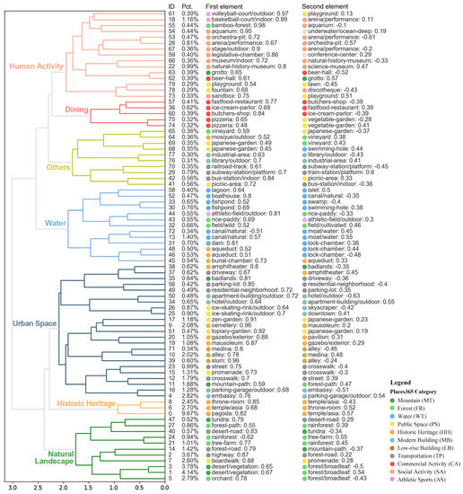 Components are a summary of multiple elements and a record of the emergence of city image typologies. It represents the interaction among multiple elements rather than two, as shown in the co-presence dimension, showing the main types of imagery elements from the bottom up. By mapping the dendrogram, we unfolded the pedigree of the component extracted from every detected element (Figure 7). In our model, 80 principal components (PCs) were detected through the truncated SVD model, in which the absolute values of probability are input, and these principal components can explain 83.64% of the raw variation in the detected elements. For annotating each PC, we use the dominating elements with the top 2 loading as the first and second elements. These PCs can be grouped into 7 typologies according to their rank in terms of similarity: urban space (24.61%), natural landscapes (22.29%), historical architectures (14.82%), water (8.05%), sports & social activities (7.50%), catering (2.07%) and others (4.30%). This is different from what has been pre-defined in the Place 365 model regarding with the number and inclusion relations. The first and second elements for each PC demonstrate that the PC detected is a new organization of 365 elements.