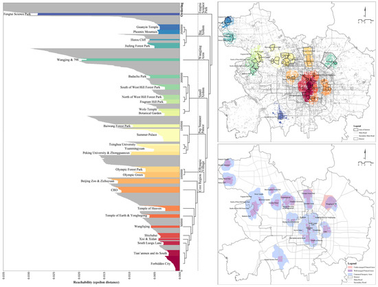 The morphologies of imagery elements are geographically heterogeneous, whereby shaping the imagery areas where citizens are more likely to record the city images they see than other places. There are 29 imagery areas detected in Central Beijing, accounting for 76.32% of the volunteered photos, as shown in Figure 9. The map shows a heterogeneous pattern where some imagery areas are agglomerated as larger, spatially continuous clusters. The dendrogram of the hierarchical clustering yields that these individual imagery areas can be grouped into seven main clusters according to the density variation of photo-taken behaviours (Figure 9). The first cluster is the core region (the central zones centred in the Forbidden City and surrounded by the Third Ring Road), where ten detected imagery areas are spatially agglomerated. Four clusters are moderately diverse, featuring several individual imagery areas, including the areas around the Olympic Village, Pan Summer Palace, Small West Hills, and Big West Hills. The Wangji area and Fengtai Science Park, however, are two clusters that are spatially independent from the context in which they are embedded. These results demonstrate that the spatial interaction between imagery areas varies significantly from place to place, and it might be at a higher level for long-lasting, historic, or developed areas but at a lower level for newly built destinations.