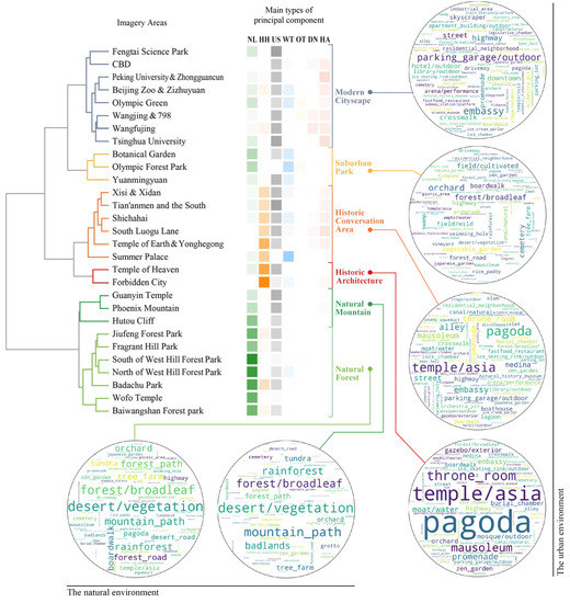 For a better understanding of the composition of imagery elements, we clustered the imagery areas into 6 basic types that are featured with the main categories of elements detected in Figure 7 (Figure 10). These 6 basic types can be further grouped into two overarching categories, namely the urban and natural environment. The imagery areas of the urban environment are more diverse with more dining and human activities than that of the natural that are highlighted with natural landscapes and urban spaces only. To present more information about the element composition for each basic type, we plot the clouds with the first and second elements in each PC and normalize their presence probabilities to secure the comparability. The imagery areas of historic architecture are the ones with the most distinctive composition of elements. Pagoda, Asian temple, throne room, mausoleum are the leading elements with larger weights than any other elements in other groups. The areas of historic conservation areas are also featured with some similar elements which, however, are less weighted than those in the areas of historic architecture. The city images in the modern cityscape areas are more likely to be shot outdoors with city squares/streets, high-raised or public buildings, and social activities. These images are also informatively richer than most of the other areas due to the largest number of elements with relatively even weights in the cloud. For the natural environment, the areas of forests differ from areas of mountains as they maintain more significant elements. This annotation information enhances the interpretability of the pattern imagery areas, and the detected PCs are the features enabling this step.
