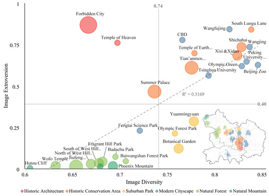 Image extroversion and diversity of 6 types of imagery areas of Central Beijing (Note: Bubble size represents the data size of the imaging area).