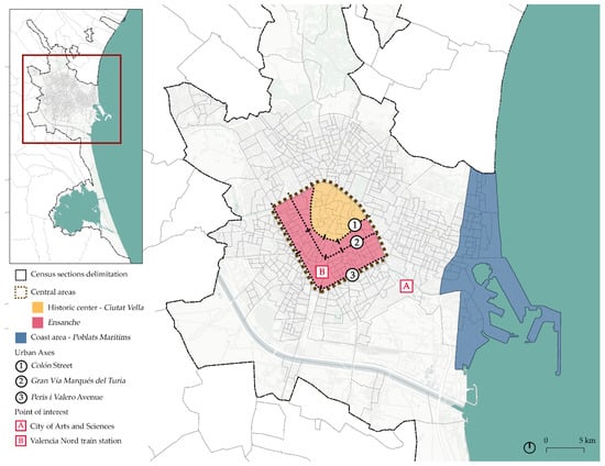In order to develop the spatial analysis, the municipality was divided in 596 spatial units based on the census sections of Valencia, which is the smallest unit of disaggregation for population data and statistical information according to the INE. Figure 1 shows the census section delimitations for the Valencia municipality. Three relevant urban areas are differentiated: the historic center—also known as the Ciutat Vella; the Ensanche—formed by those neighborhoods that resulted from the city’s growth in the 19th century; and the coastal area—also known as Poblats Marítims, traditionally a seafaring district that nowadays has become an important touristic area for the city. Significant urban axes and points of interest near the urban center are also included.