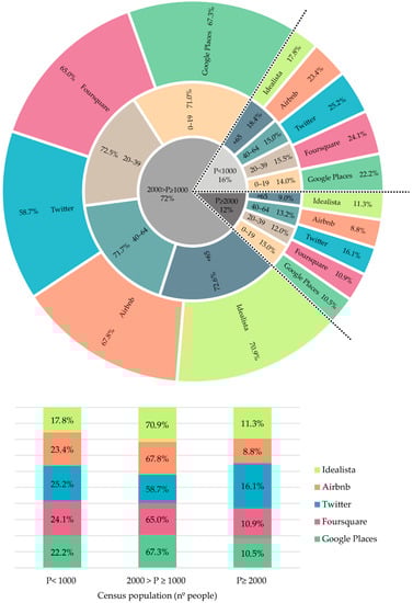 For the analysis, Valencia’s census sections were adopted as the geographical areas of study or spatial units. Three types of census sections were considered: those with less than 1000 inhabitants; those whose population ranged between 1000 and 2000 inhabitants; and those with more than 2000 inhabitants. Figure 3 presents, in aggregated format and according to the census population range—p < 1000, 2000 > p ≥ 1000 and p ≥ 2000—the overall percentage of datapoints collected for each age group, that is to say, the age distribution and the amount of LBSN data as per this classification. As shown in Figure 3 (upper), of the total population, more than 70% for all age group ranges and more than 50% of the social networks data were located in those census sections with a population of between 1000 and 2000 inhabitants. Figure 3 (lower) shows the proportion of each social network data per census sections type, according to the number of inhabitants.