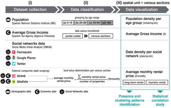 Various data sources have been used for this study (Figure 2). Specifically, economic data includes average gross income, while demographic data includes population age. Moreover, the data from five social networks, namely, Google Places, Foursquare, Twitter, Airbnb and Idealista, are also included.