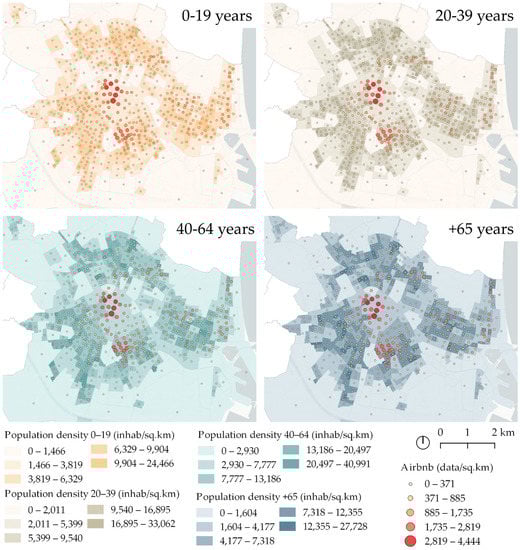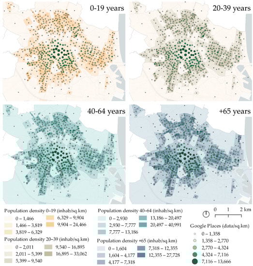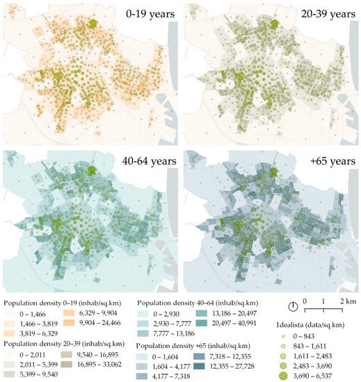 The visualization of population density shows that the highest of the four established age groups was generally organized radially around the historic center (Ciutat Vella area)—see Figure 1—and in areas near the coast, but without densifying the frontline. However, a density increase was noticed in the main axes and certain areas of the historic center near the Ensanche.
