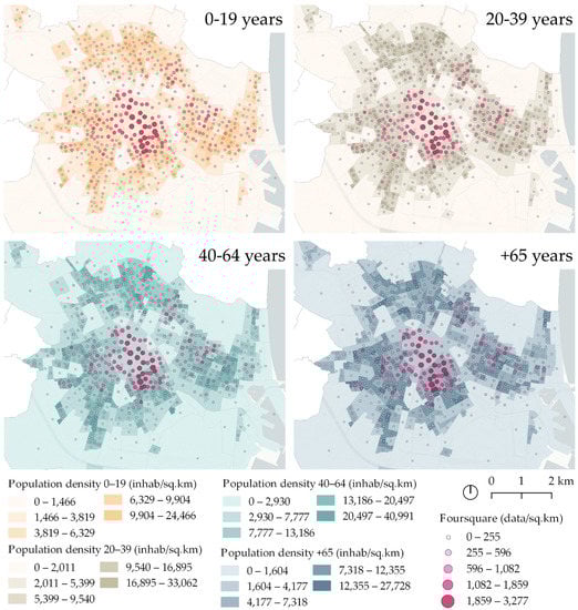 While previous research was concerned with the relationship between the activities reflected in a single LBSN source such as Foursquare [10,11,12], Airbnb [13] or Twitter [14,15,16,17] and the social network’s penetration (taking into consideration users’ demographics and economic factors such as age, race, nationality or income), the contribution of this paper is twofold. Firstly, the focus of the study is on the demographic profile of the population within the city areas where data are being generated, instead of focusing on the demographics of users that generate the data. Secondly, multiple layers of information from different LBSNs are overlaid, providing a broader perspective on the opportunities and limitations with respect to the representativeness and complementarity of these data for their use in urban studies.