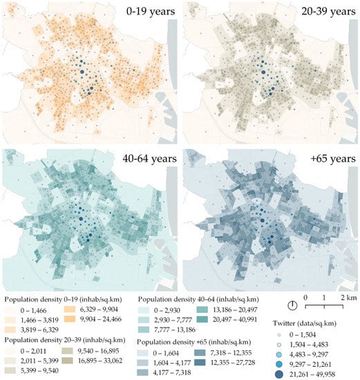 The 5-year range groups of population defined by INE and included in the census sections delimitation, were placed into broader age groups for this study. An initial grouping was suggested differentiating between active and inactive population [75]. However, in the end, a higher level of disaggregation was considered, especially in the age range corresponding to active population, due to the great variability of social media usage that can occur in this age group. Therefore, the population was finally divided into four groups or age ranges: (i) from 0 to 19, (ii) from 20 to 39, (iii) from 40 to 64 and (iv) 65 and over. Population density was then calculated for each age group.