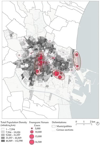 From the comparison between population density and LBSN data density it was found that areas with lower population density in all age groups—except for some areas of Ensanche (see Figure 1) where the density is slightly higher—match those with the highest data density from Foursquare, Google Places, Twitter and Airbnb (Figure 5, Figure 6, Figure 7, Figure 8 and Figure 9). Moreover, according to the Foursquare dataset, the areas with the highest data density and the location of the top ranked ten venues with the highest number of registered users were located in the historic center, the coastline and the area surrounding the City of Arts and Sciences (Figure 10). Furthermore, the fact that these less-populated areas concentrated most short-term accommodation properties in the city, according to the Airbnb dataset, suggested that both the city center and the coast were mostly where properties were not intended as a main residence, but for touristic accommodation (Figure 11).