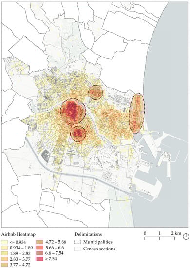 In the last few decades, Valencia was characterized by urban intensification, a higher presence of a young population, and coastalization as tourism intensified [51]. According to the Spanish National Statistics Institute (INE), the number of visitors and overnight stays grew exponentially in the last five years, with a significant drop in 2020 due to COVID-19 pandemic restrictions [52,53]. Tourism growth in Valencia was also reflected in the presence of Airbnb properties located, following the trend of other Spanish towns, particularly in the city center and close to tourist hotspots [54]. This was related to the presence of touristic sites and the concentration of leisure activities, but there were also other factors related to the spatial distribution of these properties, such as urban renewal strategies in certain areas or neighborhoods, or the legal framework [55]. However, the lack of a regulatory framework means that those areas where most short-rental Airbnb properties were concentrated, were also experiencing gentrification [56].