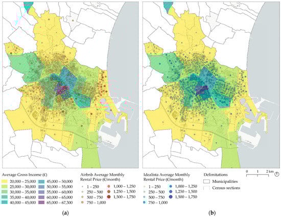 Average gross income and properties’ monthly rental price for (a) Airbnb and (b) Idealista.