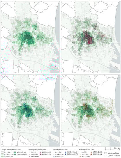 Moreover, a consideration that should be taken into account in regard to the data points’ spatial distribution is the fact that social networks are used differently depending, among other factors, on the geographical context. For instance, in a certain geographic region the registers may be predominantly related to the residential category, whereas in Valencia, the Foursquare venues under the residential category were not significant. This could be one of the reasons why Foursquare data density in Valencia did not extend to suburban areas. However, entertainment and shopping areas stand out in the number of check-ins, especially in the city center area. Therefore, there was a variability in the number of registers per category, the total number of check-ins, and where they were located. In this respect it is worth noting that Airbnb was the only social network with relevant data density outside the central areas of the city—more specifically in the coastal areas, where Twitter, Foursquare and Google Places data density was lower.