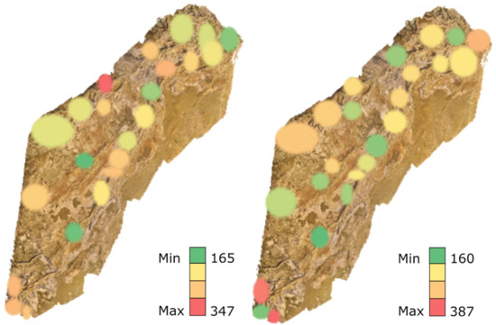 The number of fixations did not differ significantly between expertise levels (F(1, 371) = 0.6, p > 0.05), but there were significantly (F(50, 371) = 3.3, p < 0.05) more fixations on AOI Drone 1 (top left corner of the orthomosaic map) than on any other AOI. This is evident when inspecting the heat maps for the orthomosaic map (Figure 4) where both the experts (right) and the novices (left) had many fixations in that area.