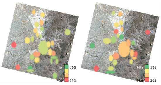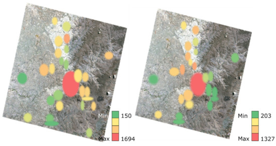 Heat map for visit duration in milliseconds for novices (left) and experts (right) on the satellite map.