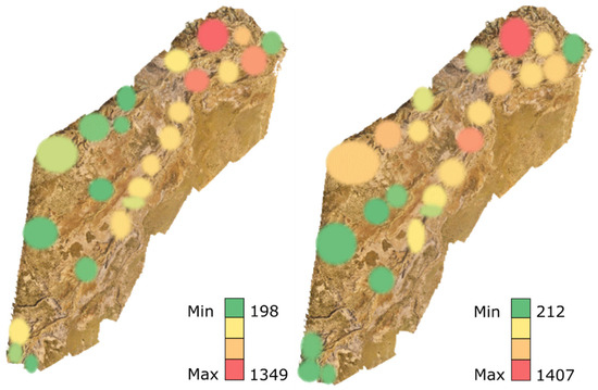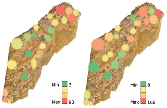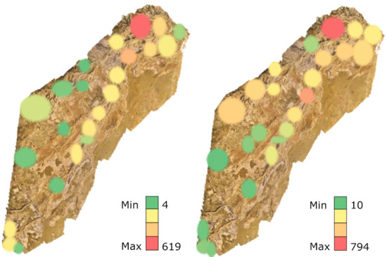 Number of visits for each participant on the satellite (left) and the orthomosaic (right) map.