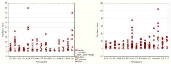 Recall that a visit is defined as the entire time spent within the bounds of an AOI without leaving the AOI. Hence, each visit can constitute several fixations. Analyzing the number of visits will give a clearer idea of which AOIs kept attracting the attention of the participants and to which AOIs they kept returning.
