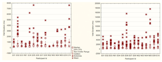 Novices had a mean fixation duration of 220.4 ms and 220.6 ms for the orthomosaic and satellite map, respectively, while experts had a mean fixation duration of 215.1 ms and 224.8 milliseconds on the satellite map. The mean fixation durations for both maps and groups are slightly shorter than the typical fixation duration for visual search. At an α-level of 0.05, there was no significant difference between the fixation durations of experts and novices (F(1, 371) = 1.98, p > 0.05), and none between the various AOIs (F(50, 371) = 1.07, p > 0.05). The graph below (Figure 1) shows the fixation duration metrics for all participants for the two maps. Experts are prefixed with “E” in their participant’s name, and novices are prefixed with “N”. The box plot for the satellite map is on the left, and the orthomosaic map is on the right.