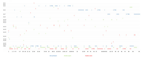 The sequence charts for, respectively, the satellite (Figure 13) and orthomosaic (Figure 14) map for the best participant (blue), the random expert (green), and the random novice (red) are shown below. The “other” AOI indicates fixations on areas outside the marked AOIs, and very long visits are indicated by the number of subsequent fixations in brackets instead of graphically.
