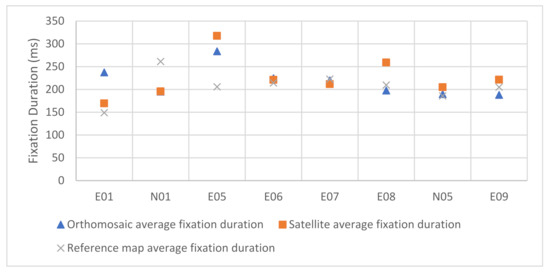 Average fixation duration between orthomosaic, satellite map, and the reference map.