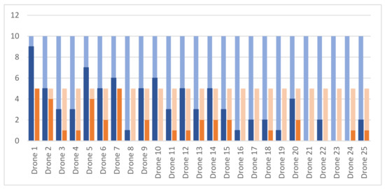 At an α-level of 0.05, there was no significant difference between expertise levels (F(1, 371) = 2.02, p > 0.05); however, Drone 1 had significantly more visits, on average, than any other AOI (F(50, 371) = 2.2, p < 0.05).