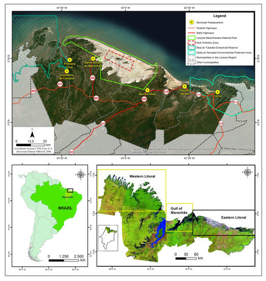 The Lençóis Maranhenses region is located on the east coast of the state of Maranhão in northeastern Brazil. It includes a national park and overlaps with other Conservation Units such as the Extractive Reserve of Tubarão Bay, the Parnaíba Delta Environmental Protection Area and the Pequenos Lençóis Environmental Protection Area (Figure 2). The area presents extreme physical, geographic and climatic contrasts, in addition to economic diversity and emerging tourism. It presents unique geoenvironmental dynamics, with its extensive dune fields shaped continuously by the action of winds and rainwater [13,14,22]. A geologically rare phenomenon, it is the largest recorded area of dunes formed in the active dune field of Quaternary [23,24,25].