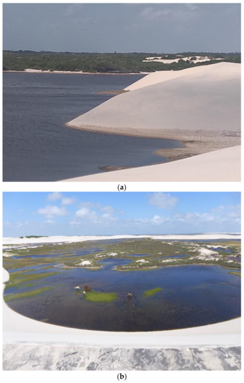 The Lençóis Maranhenses region is characterized by the dynamics of two distinct periods: the rainy season (high rainfall, full lakes) and the dry season (low rainfall, dry or low-water lakes) [22,24,25]. The lakes and watercourses in the fixed dune areas depend almost exclusively on rainfall to sustain their ecosystems. In the interdune areas are vargens, grasslands that are used to feed animals and are important for the physical and economic survival of the local populations (Figure 3). This mosaic of landscapes, in which water fills the interdune depressions at certain times of the year, is exuberant and paradisiacal. The mobile dunes, locally called morrarias, continuously advance inland over the vegetation in a predominantly northeast-southwest direction, and have now reached a distance of approximately 27.5 km from the coast. Morrarias is typically defined as a succession of hills, but in the Lençóis Maranhenses region it applies to sand dunes, including ones covered by vegetation, and even old, consolidated dunes (paleodunes). In addition to perennial and temporary dunes and lagoons, there are strips of straight beach, perennial rivers (Rio Preguiças, Rio Periá), bays, tidal channels, mangroves and islands located in the Extractive Reserve of Tubarão Bay in the western part of the study area.