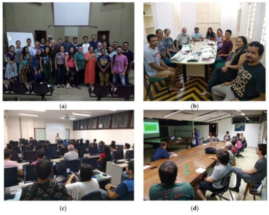 (a)—Lecture at UFMA; (b)—Meeting at CNPT; (c)—Training on the Nunaliit platform; (d)—Meeting at USP.