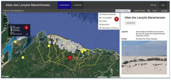 We have developed a prototype of the graphical interface and data layers within the boundaries of the study area, the toponymy of the locations studied, the satellite image background, and the preliminary structure of the Cybercartographic Atlas (The Lençóis Maranhenses Atlas prototype [36] can be found at this link: https://atlas.fflch.usp.br/index.html) (accessed on 31 August 2021). During the first stage of the project it was possible to prepare, in partnership with Carleton University’s Geomatics and Cartographic Research Centre, a layout for the Atlas displaying three types of information (Figure 5). Item A, the Layers Button, allows you to choose the background information base (relief, images, maps); item B allows you to enable layers of information to be overlaid on the background information (Municipal Limits, Location of Communities, points of Observations); and item C shows the Atlas study area where the points visited and monitored by the team are spatialized.
