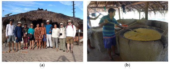 (a)—Field activity in the community of Baixa Grande – Primitive Zone of Lençóis Maranhenses National Park. (b)—Production of mandioca flour in the community of Mairizinho, municipality of Primeira Cruz—MA, located in the extreme western part of Lençóis Maranhenses National Park.