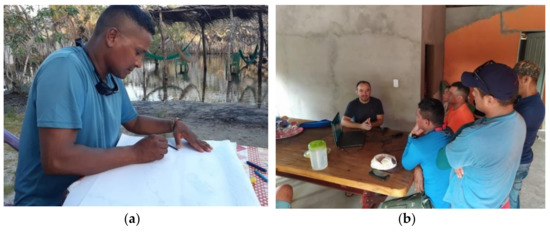 (a) Resident of the community of Betânia, Santo Amaro—MA drawing the mental map of the trails he uses. (b) Roundtable with community members and guides to introduce the ASALM project.