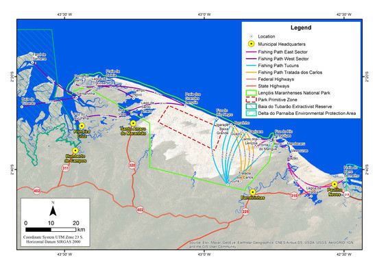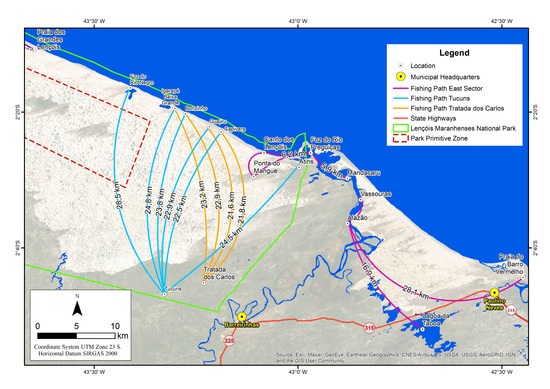 Knowing and mapping the practices developed by the residents of the region of Lençóis Maranhenses—in particular productive activities in the primary sector of the economy, i.e., agriculture, livestock, fishing and plant extraction—is also essential to understanding the impact of socio-spatial transformations that the region has experienced [20,21]. For example, the construction of new state highways connecting municipalities in the Lençóis Maranhenses region has resulted in increasing tourism and urban expansion. In such cases, cartography can serve as an instrument for planning, understanding and action, both to safeguard the rights of local residents and for the handling and management of natural resources.