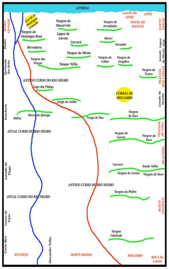 Native inhabitant’s mental map of a region of Lençóis Maranhenses National Park. In this mental map, Mr Inácio, 75 years old, indicates the vargens (pasture areas for goats and sheep—in green), the old and current courses of the Rio Negro (red and blue, respectively), the layout of corrals (in yellow) used in animal husbandry activities, and the arrangement of some traditional communities, highlighted in red font. Created by Mr. Inácio, from Mocambo. Reproduced by Benedito Souza Filho.