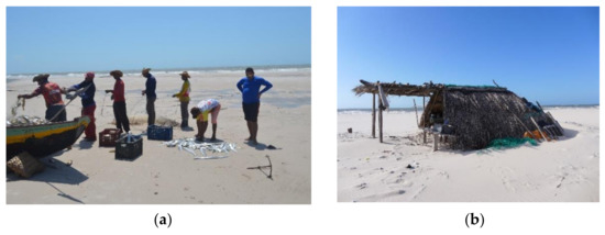 Fishing is an activity developed in several places in the study area, even populations that reside in areas farthest from the sea. Around the Conservation Units, in particular PNLM and the Preguiças River Environmental Protection Area, the local residents fish in the sea on a seasonal basis, i.e., during the rainy season when there is a greater abundance of fish in the ocean waters. To carry out their fishing activities, they install themselves in small “ranchos” huts built on the Grandes Lençóis beach and along the mouth of the Preguiças River (Figure 10).