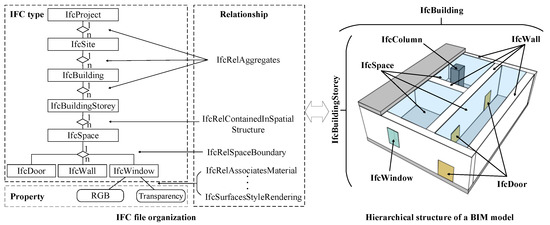 BIM semantics mainly describe architectural details (more than 600 definitions of building entities and 300 definitions of component types) and semantic connections between various building entities [14,27]. As seen in Figure 1, a hierarchical project structure defined by BIM/IFC comprises a well-defined set of semantic information, which includes basic building entities (e.g., IfcProject, IfcSite, IfcBuilding, IfcBuildingStorey) and the relationship called IfcRelAggregates. IfcWindow is associated with properties such as color and transparency via IfcSurfacStyleRendering and other semantics. A detailed description can be found in the IFC4 standard [28].