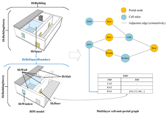 Portal entities (e.g., IfcWindow, IfcDoor, and IfcStair) define portal nodes () in the graph (e.g., type, FID, and “visibility”, as described in Section 3.1). The edge in the graph represents the connection between nodes. Each building floor (IfcBuildingStorey) can create a single-layer cell-and-portal graph, and then floors are associated with each other through , which finally forms the multilayer cell-and-portal graph in the BIM model.