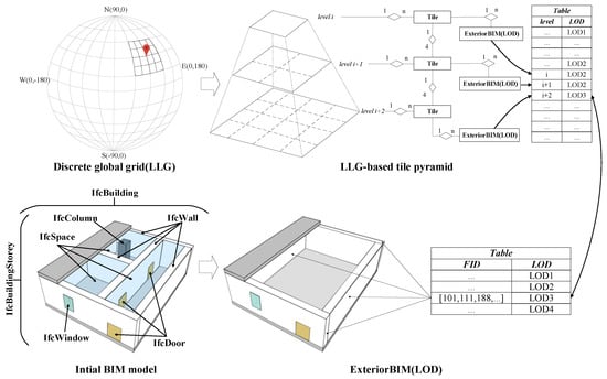 As shown in Figure 3, exterior building entities () first are obtained from each BIM model using previous algorithms that aim to reduce the computing burden [18,19]. Then, similar to other multi-scale GIS data sources (e.g., terrain, satellite imagery, and oblique aerial images) in virtual globes, we employ the LLG-based tile pyramid of the discrete global grid to organize the [12,34]. The in the upper-level tile is simplified geometrically by the in the lower-level tile. Explicitly, the multilayer cell-and-portal graph index building entities inside the (Figure 2) and the portal node in the have the following property: in two associated .