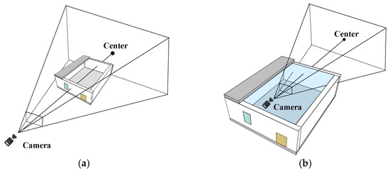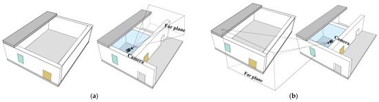 We proposed a semantic-based scheduling algorithm for indoor scenes in 3D GIS (Algorithm 2). This algorithm includes three key steps. First, building entities associated with the current IfcSpace are obtained according to the camera combined with the multilayer cell-and-portal graph (see Section 3.2.2); the entities are added to the . Second, “visibility” is recognized by a similar method as described in Section 3.3.1, and used to determine whether the associated information is loaded. As shown in Figure 5, if “visibility” is false, the far plane of the camera is set as the diameter of the bounding sphere from the BIM model (Figure 5a); if “visibility” is true, the far plane is expanded, and associated entities and other multi-scale GIS data are added into the by view-frustum culling (Figure 5b). Finally, the is sent to the GPU for drawing.