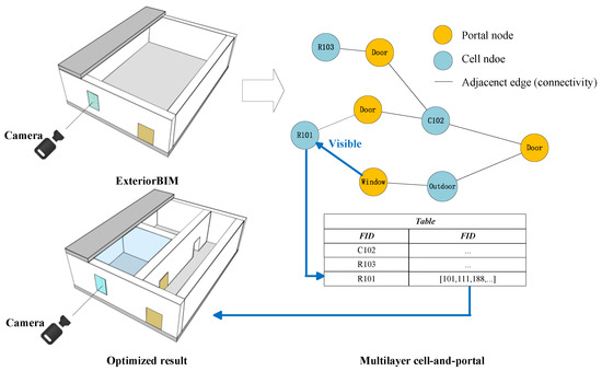 Besides, there are significant technological challenges when applying a large number of BIM models to the geographic environment with limited hardware resources. Previous studies have generally reduced geometric data by mesh simplification or by conversion to lower level of detail (LOD) models [16,17]. However, these approaches can change topological relationships between indoor spaces and the geometric accuracy of the building [18]. To address this issue, some studies have extracted exterior entities from BIM models, which can dynamically reduce geometric information by removing non-exterior entities from outdoor views. Moreover, when entering into the indoor space, it is possible to load indoor entities and even remove other BIM models from outdoor scenes [18,19]. However, previous algorithms face the following two problems. First, current methods directly remove occluded features and neglect special BIM semantics (e.g., transparent window or open door), which may lose some geographical features. Specifically, previous methods cannot observe complete outdoor scenes near windows from indoor views, and cannot see complete indoor information near windows from outdoor views, which causes an unreasonable roaming process and limits the spatial analysis and application in the smart city. For example, a previous study lost a part of exterior building features, and thus could not support solar radiation and lighting analysis (such as the interior solar shading analysis) in the green building [20]. Second, the algorithms explicitly did not focus on the visualization optimization in the indoor space further, which may have heavy hardware resources when loading large and complex indoor buildings from indoor views. Therefore, we noticed that the indoor environment can be divided into multiple enclosed spaces, and other invisible indoor spaces (e.g., rooms) removed by the current location of the indoor view would efficiently reduce data volume.