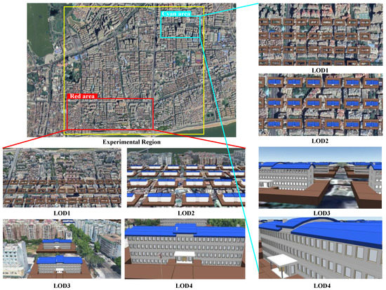 BIM models and oblique aerial images for the red area: (a) LOD2 (level-of-detail) models; (b) LOD3 models.