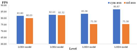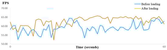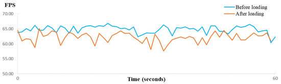 As shown in Table 4, the numbers of incremental triangles relative to the original data for area 1 and area 2 were just 1.62% and 1.87%, respectively. For area 1, the average frames per second (FPS) before and after loading were 59.07 and 62.68 (Figure 14), respectively; for area 2, the average FPS before and after loading were 64.82 and 62.02 (Figure 15), respectively. The lack of significant change in FPS verifies the effectiveness of our proposed method.