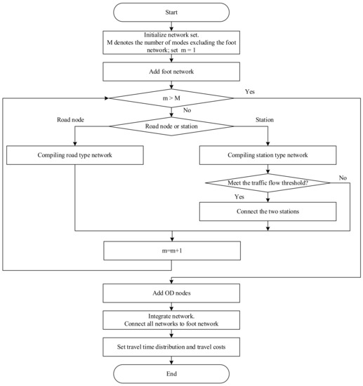 We take five steps to build a multimodal network: mode selection, node selection, node connection inside mode, node connection between modes, and OD (origin–destination) nodes connection.