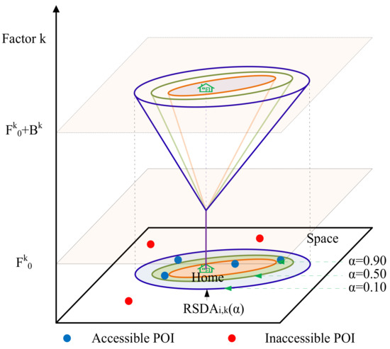 By calculating the intersection of the areas of various dimensions, we can obtain the reliable multi-dimension area (). Then, we use POI (point of interest) to represent opportunities and take the number of opportunities in to represent the position accessibility. The formula of the bi-objective opportunity model is shown in Equations (1)–(3).