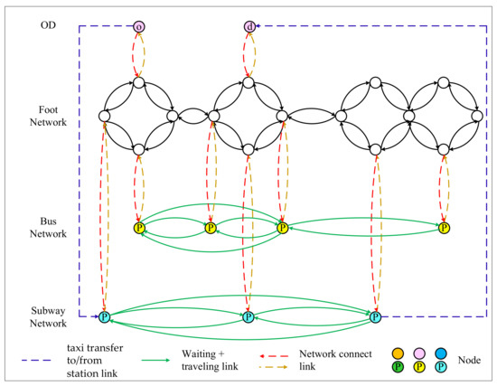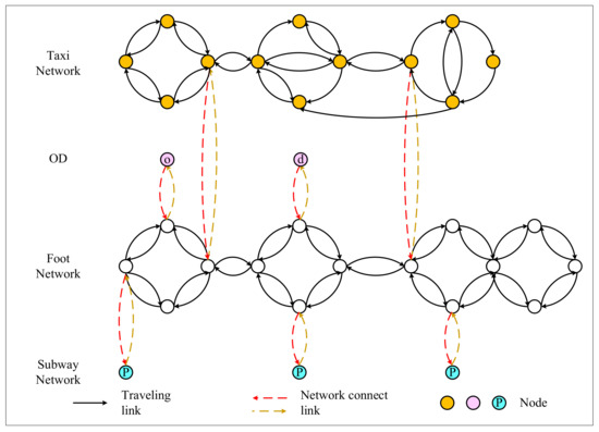 Taking the network, foot network + bus network + subway network+ taxi transfer to subway from the origin + subway transfer to taxi to the destination, as an example, we present the steps of network division as follows.